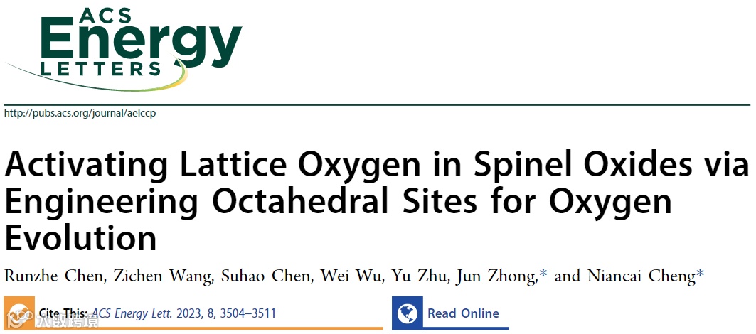 近日,福州大学的程年才教授与苏州大学钟俊教授联合在国际知名期刊《ACS Energy Letters》上发表了题为“Activating Lattice Oxygen in Spinel Oxides via Engineering Octahedral Sites for Oxygen Evolution”的文章。该工作通过对尖晶石氧化物NiFe2O4的电子结构和晶体结构进行调控,在其八面体位点构筑丰富的Ni4+阳离子与Ni空位,有效提升NiFe2O4中金属d轨道和氧p轨道之前的电子杂化,增强金属-氧键共价,从而激活晶格氧参与OER过程,并促进从AEM到LOM的路径转换,实现高效稳定的OER催化。
