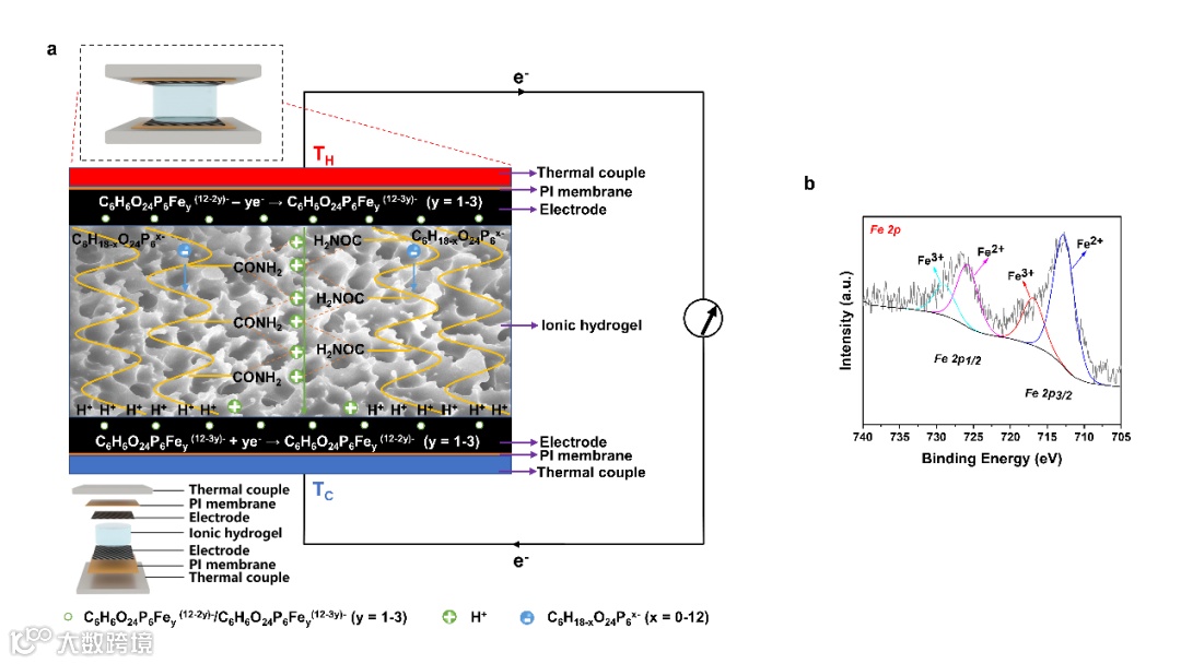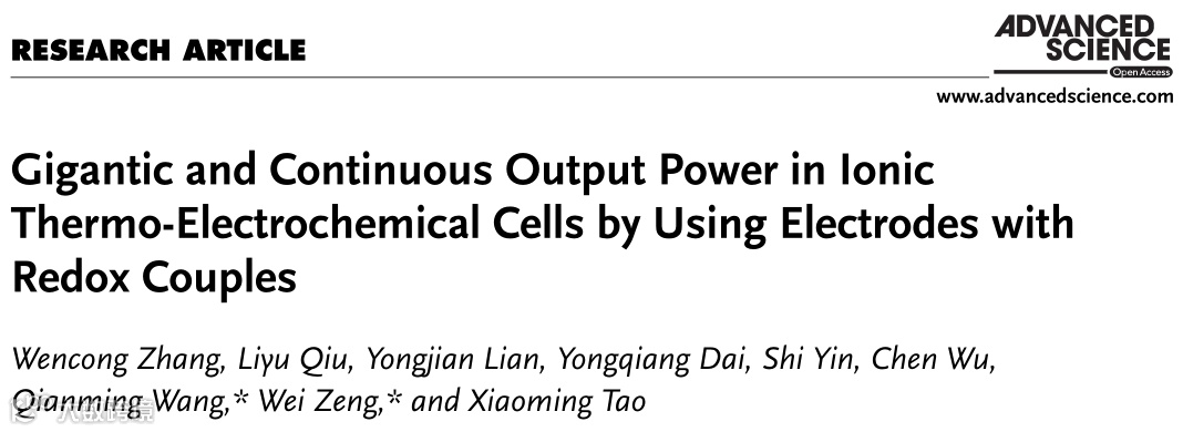 低品位热能广泛存在于环境和工业生产过程中,如:太阳余热、车辆、工业、电子等。由于缺乏经济高效的能源回收技术,这部分能量通常被废弃。传统的热电材料在热电势方面存在限制,通常只能提供较低的热电势(μV/K)。为了克服这一限制,离子热电化学电池(TEC)作为一种有效的新型热电材料被提出,它可以提供更高的热电势,达到每度每毫伏(mV/K)的水平。然而,由于离子不能通过外电路而被限制在液体/电解质介质中,导致其热电转换效率较低。在此,本文将氧化还原电对引入电极表面,可以最大限度地提高传质效率,从而提高离子热电化学电池(TEC)的热电转换性能。