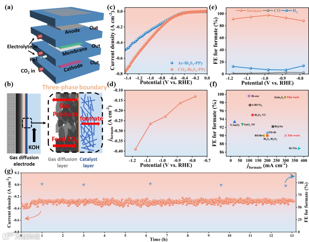 图4. (a-b) 流动电解池示意图。(c) Bi2S3-PPy在CO2或Ar饱和的1.0 M KOH中的LSVs曲线。(d) 不同电位下的甲酸电流密度。(e) formate、CO和H2的法拉第效率。(f) 在-250 mA cm-2和-300 mA cm-2的电流密度下,对比了FEformat和jformate Bi2S3-PPy和现有报道相关催化剂的催化性能。(g) Bi2S3-PPy在- 0.98 V vs . RHE下的稳定性测试。