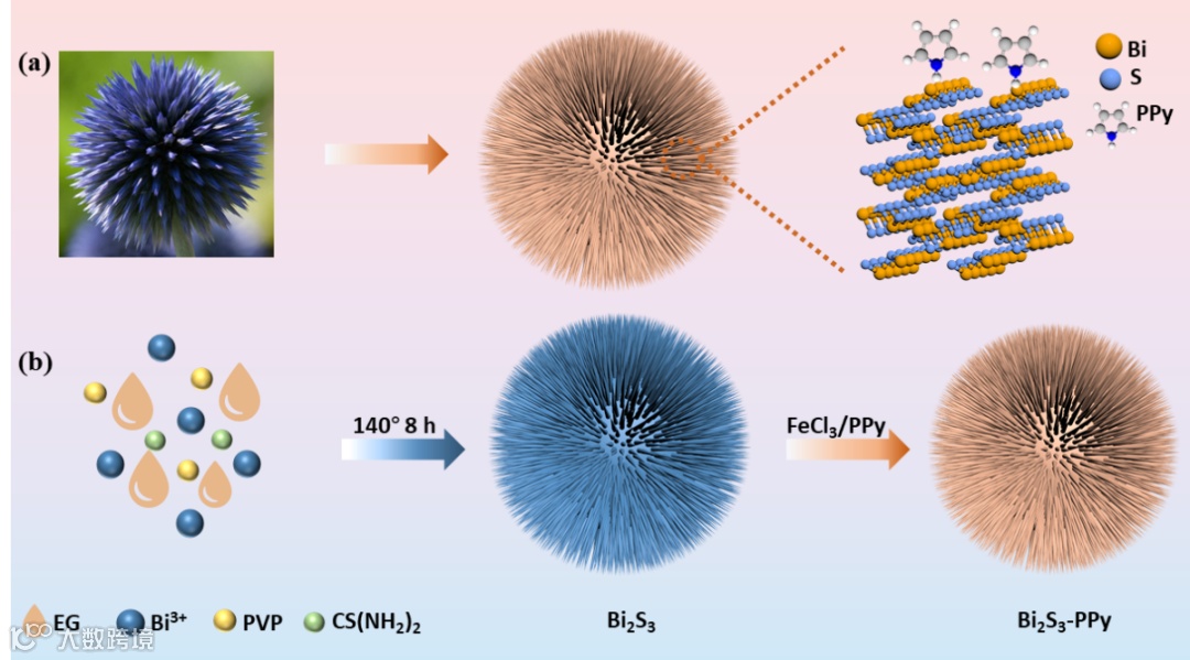 图1. (a) 受植物蓟启发的纳米结构设计和 (b) Bi2S3-PPy复合催化剂合成示意图。