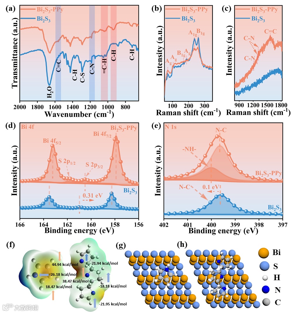 图3. (a) Bi2S3-PPy和Bi2S3的FT-IR图谱和 (b-c) Raman谱。(d) Bi 4f和 (e) N 1s的高分辨XPS图谱。(f) 吡咯(左)和聚吡咯(右)的静电势。吡咯和PPy吸附在Bi2S3 (211) 表面的 (g , h) 模型。