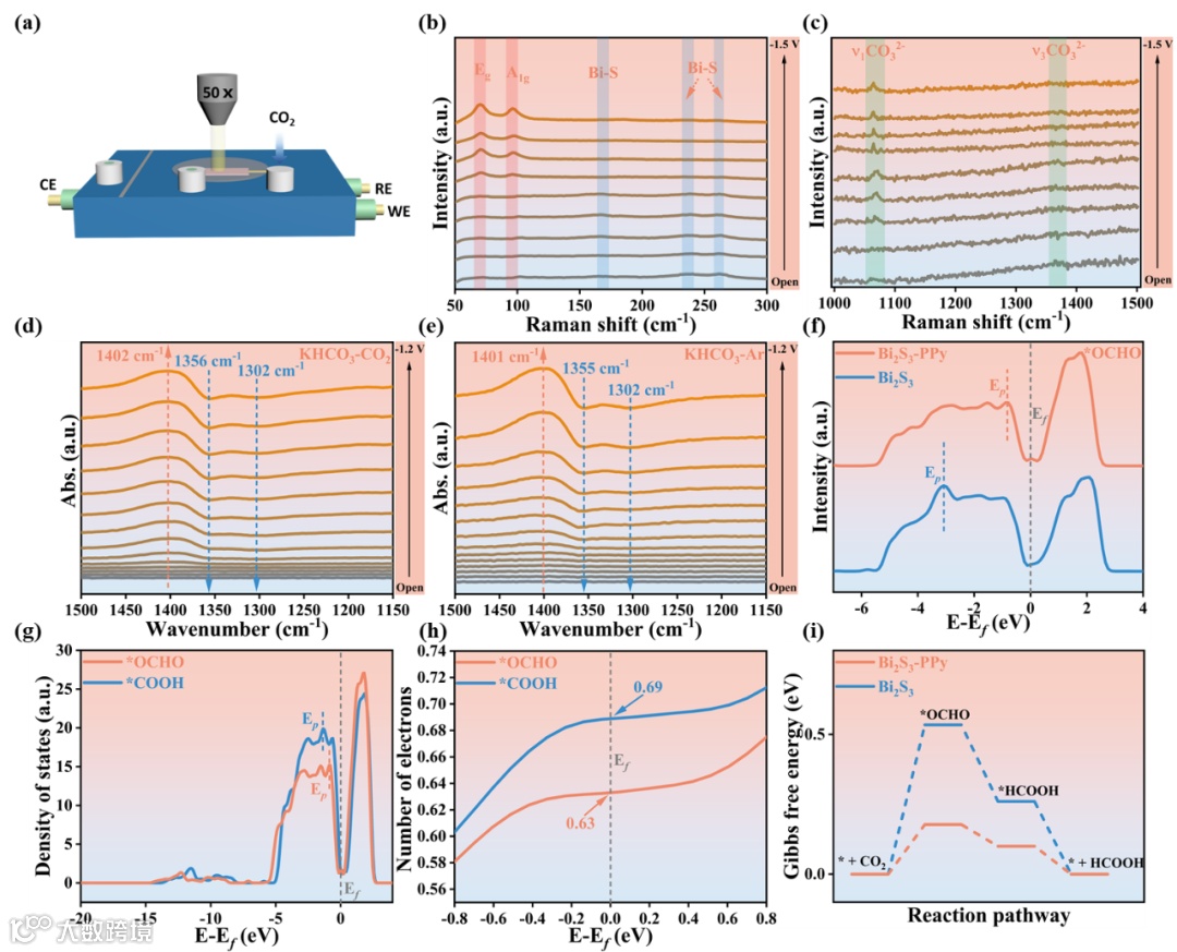图5. (a) CO2RR原位拉曼测试示意图。(b-c) Bi2S3-PPy不同电位下的原位拉曼光谱。在 (d) CO2和 (e) Ar饱和的0.5 M KHCO3中的原位ATR-IR光谱。(f) *OCHO的 p轨道态密度图。(g) *OCHO和*COOH在Bi2S3-PPy的p轨道态密度图。(h) *OCHO和*COOH的每个Bi原子的p轨道对应的电子数。(i) Bi2S3-PPy和Bi2S3上形成formate的自由能图。