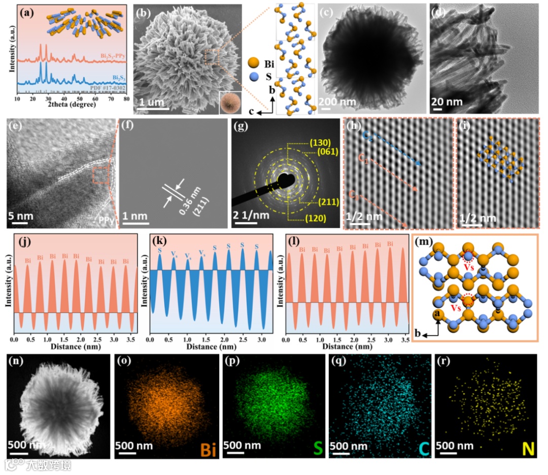 图2. (a) Bi2S3-PPy和Bi2S3的XRD图谱。(b) 典型的SEM图像。(c-d) TEM图像。(e-f) HRTEM图像。(g) Bi2S3-PPy的选区电子衍射。(h-i) (e) 中用橙色矩形标记的区域的高斯滤波降噪图像。(j-l) (h) 中虚线箭头对应的晶格条纹的强度分布。(m) Bi2S3沿[001]晶带轴的原子模型。Bi2S3-PPy的 (n-r) HAAD-STEM元素分布图。