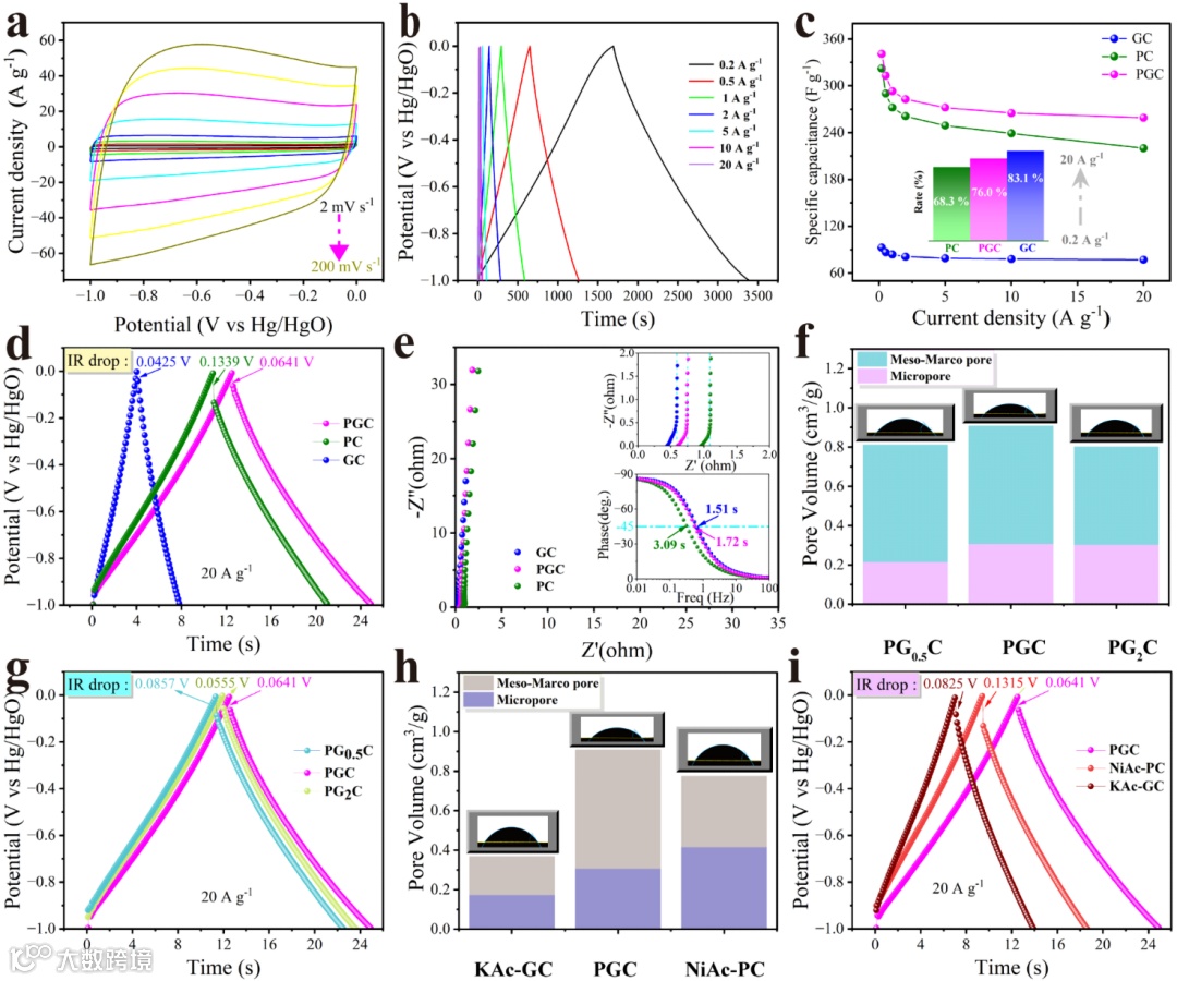图6. PGC样品(a) 在不同扫描速率下的CV曲线和(b) 在不同电流密度下的GCD曲线。GC、PC和PGC样品(c) 不同电流密度下的质量比电容,(d) 20 A g−1下的GCD曲线,以及(e) EIS谱图。(f) PG0.5C、PGC和PG2C样品的孔隙体积分布和(g) 20 A g−1下的GCD曲线。(h) KAc-GC、PGC和NiAc-PC样品的孔隙体积分布和(i) 20 A g−1下的GCD曲线。