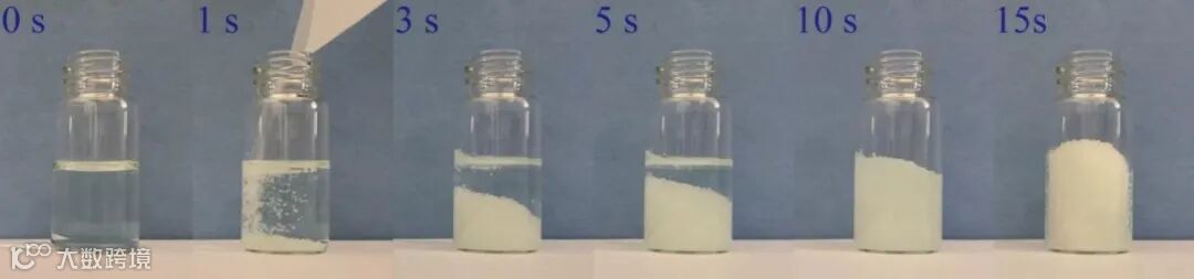 图3. 乙酸盐溶液和高吸水性树脂之间的水凝胶形成过程数码照片。