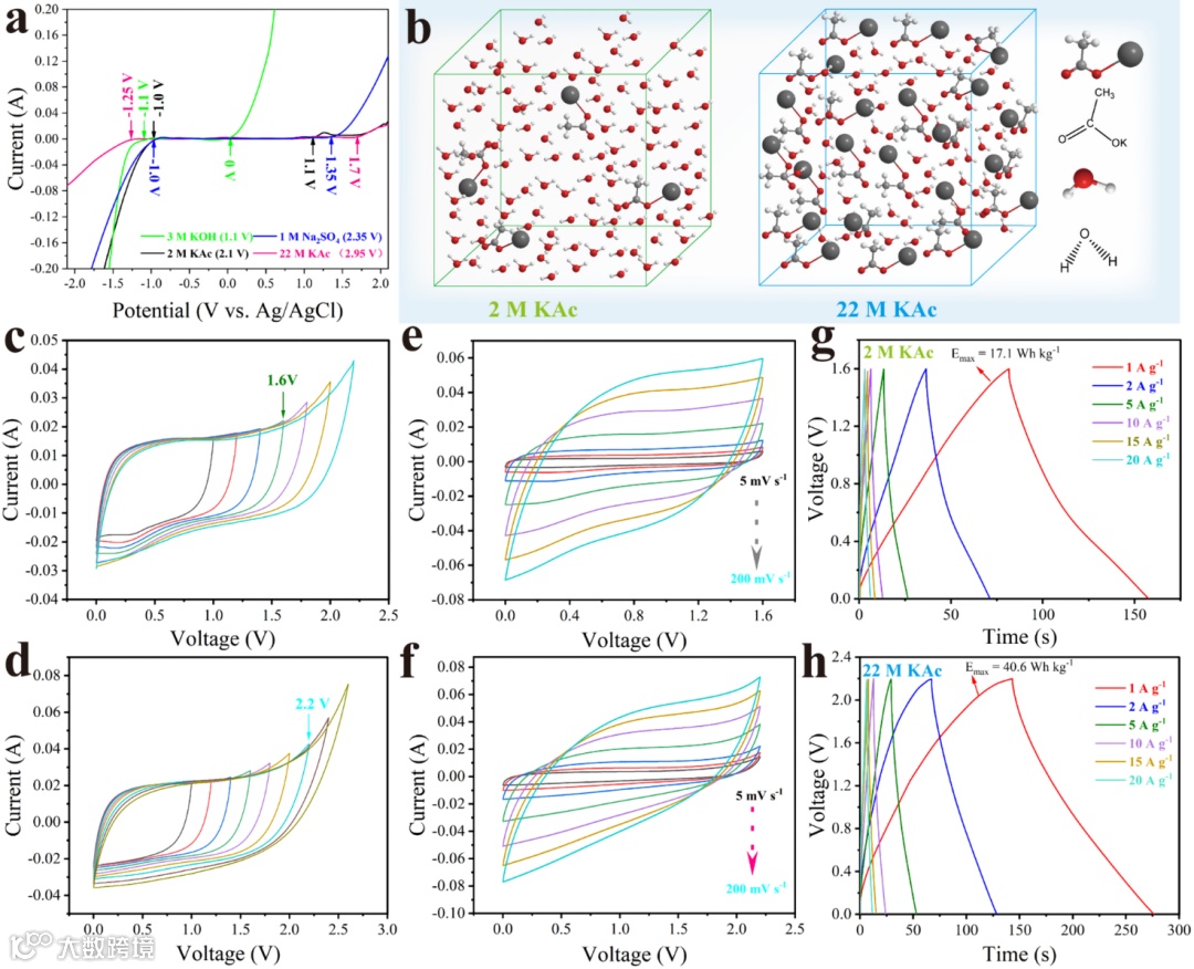 图7. (a) 反映不同电解质电压窗口的LSV曲线。(b) 在2 M KAc和22 M KAc水溶液中的水/盐分布示意图。(c) PGC//2 M KAc//PGC和(d) PGC//22 M KAc//PGC SSC器件在不同电压窗口内的CV曲线。(e) PGC//2 M KAc//PGC和(f) PGC//22 M KAc//PGC SSC器件在不同扫描速率下的CV曲线。(g) PGC//2 M KAc//PGC和(h) PGC//22 M KAc//PGC SSC器件在不同电流密度下的GCD曲线。