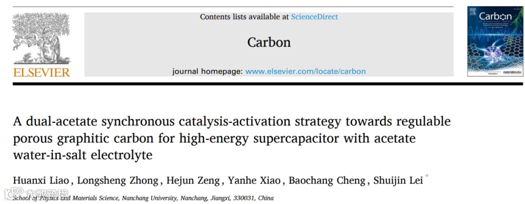 近日,来自南昌大学的雷水金教授,在国际碳材料权威期刊《Carbon》上发表题为“A dual-acetate synchronous catalysis-activation strategy towards regulable porous graphitic carbon for high-energy supercapacitor with acetate water-in-salt electrolyte”的研究文章。一方面,该研究首次开发了一种双乙酸盐[乙酸镍/乙酸钾]同步催化-活化策略,基于商用高吸水性树脂(SAP)制备多孔石墨碳(PGC)作为电极材料。有趣的是,在镍颗粒(来自乙酸镍)催化石墨化和钾物种(来自乙酸钾)化学活化的协同作用下,PGC的石墨化结构和孔隙结构均可轻松调节,以追求最佳的电化学性能。另一方面,设计了 基于乙酸钾的盐包水(WIS)电解质,能够展现出高达 2.95 V 的超宽工作电压窗口的潜力。最终组装的碳基对称超级电容器实现了最高达40.6 Wh kg-1的高能量密度和优异的慢自放电性能。
