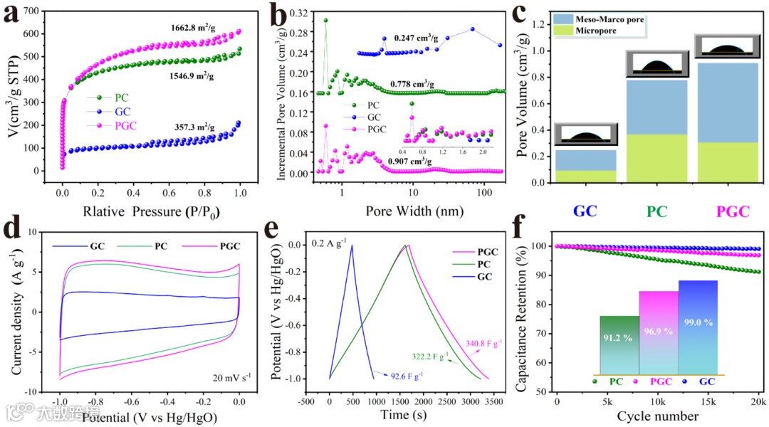 图4. 制备的 PC、GC 和 PGC 样品的(a) 氮气吸附-解吸等温线,(b) 孔径分布曲线,(c) 孔容分布直方图,(d) 扫描速率为20 mV s-1 下的 CV 曲线,(e) 电流密度为 0.2 A g-1 下的 GCD 曲线,以及(f) 电流密度为 20 A g-1 时 20000 次循环性能。