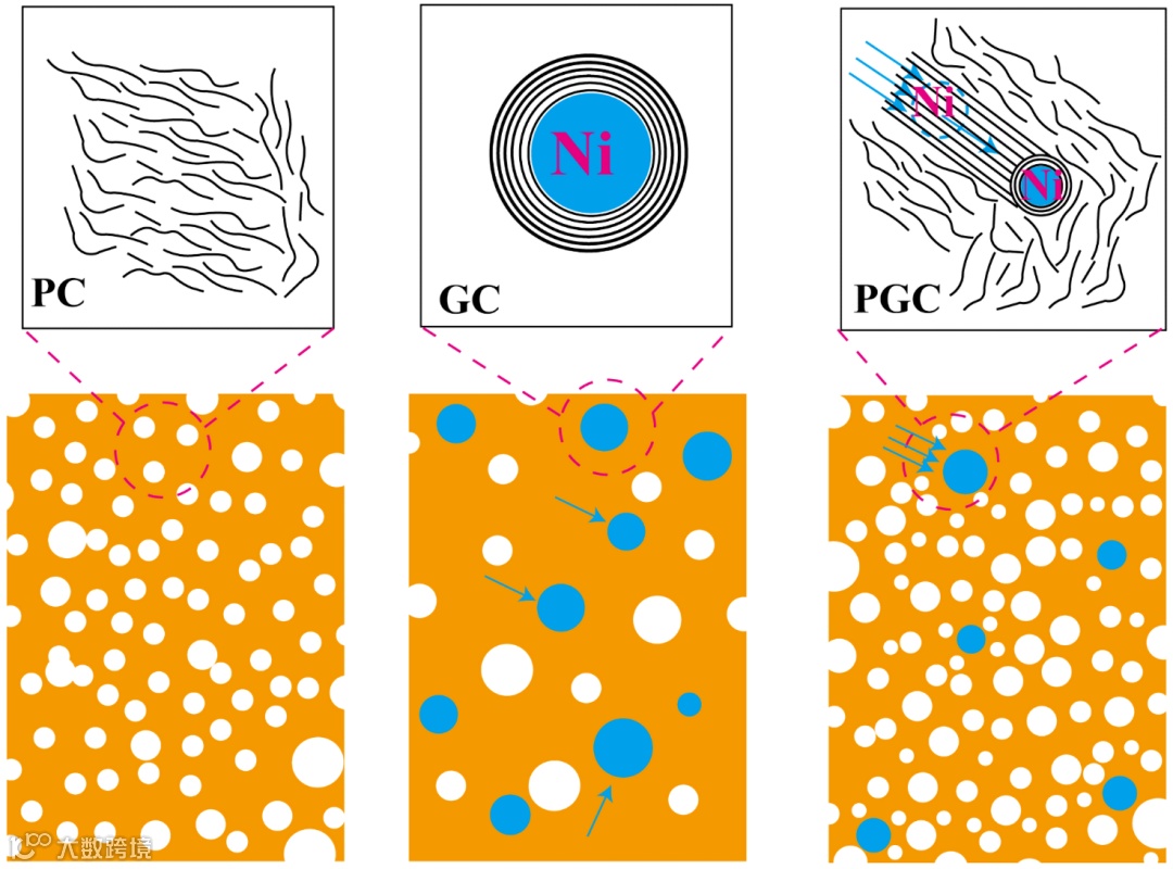 图5. PC、GC和PGC的孔隙结构分布示意图。局部放大的图像是相应的碳结构。