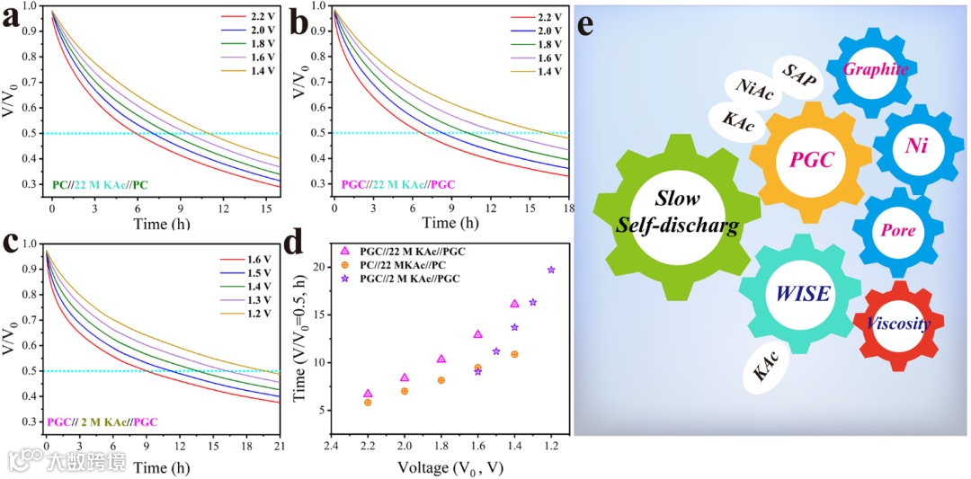 图8. (a) PC//22 M KAc//PC、(b) PGC//22 M KAc//PGC和(c) PGC//2 M KAc//PGC SSC器件的自放电性能。(d) 基于器件电压半衰期的自放电性能比较。(e) PGC和WIS电解质对自放电性能的影响示意图。