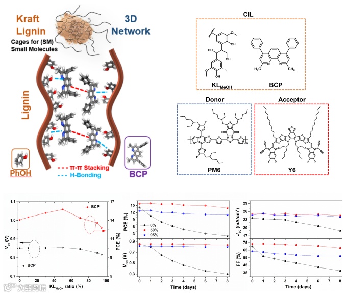 图1. 基于木质素二元界面材料的设计示意图,及其在有机太阳能电池中的应用。