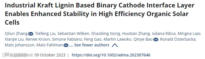 近日,来自瑞典林雪平大学的Mats Fahlman 教授团队与华东师范大学的保秦烨教授合作,在国际知名期刊Advanced Materials上发表题为“Industrial Kraft Lignin Based Binary Cathode Interface Layer Enables Enhanced Stability in High Efficiency Organic Solar Cells”的研究成果。该研究成果以工业萃取的木质素与有机半导体结合作为二元界面层,制备了高性能和稳定的有机太阳能电池,并对提高器件稳定性的机理进行了系统研究。