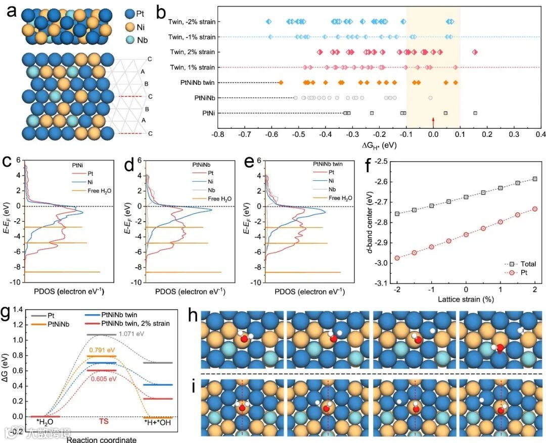 图5. 理论计算。a PtNiNb孪晶计算模型的顶视图和侧视图。b 各模型的氢吸附吉布斯自由能(ΔGH*),以及孪晶构型和晶格应变对ΔGH*的协同效应。PtNi (c)、PtNiNb (d) 和 PtNiNb twin (e) d 轨道的投影电子态密度,包括游离 H2O 分子的 PDOS 图。f PtNiNb 孪晶的 d 带中心作为拉伸应变(正)和压缩应变(负)的函数。g Pt、PtNiNb、PtNiNb 孪晶和具有 2% 压缩应变的 PtNiNb 孪晶的水解离自由能图。PtNiNb (h) 和 2% 应变 (i) 的 PtNiNb 孪晶面上水解离的动态原子构型,包括 H2O 吸附、过渡态和最终态。