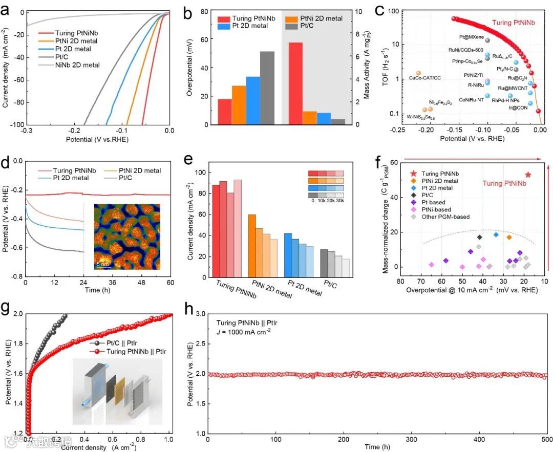 图4. 图灵PtNiNb的电化学性能。a 样品在 1.0 M KOH 中的 LSV 曲线。b 比较 (a) 中样品在 10 mA cm-2下的过电势和 100 mV 下的质量活度。c图灵 PtNiNb 和其他最近报道的碱性 HER 电催化剂的TOF。d大电流密度下的长时间稳定性测试。e加速耐久性测试期间电流密度的变化。f 稳定性测试中贵金属质量归一化的产氢电荷和 10 mA cm-2 下的过电势与其他报道的 HER 电催化剂的比较。g阴离子交换膜水电解槽中的极化曲线。h在 1000 mA cm-2 下运行的计时电位测试。