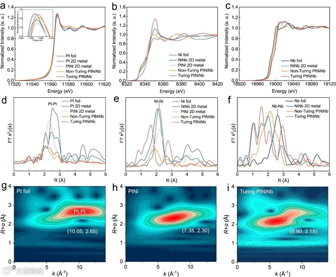 图3. 电子结构分析。在 Pt L3 边缘 (a)、Ni K 边缘 (b) 和 Nb K 边缘 (c) 处收集的 XANES 光谱。Pt L3 边缘 (d)、Ni K 边缘 (e) 和 Nb K 边缘 (f) 处的傅里叶变换 EXAFS 光谱。Pt 箔 (g)、PtNi 2D 金属 (h) 和图灵 PtNiNb (i) 的 Pt L3 边缘的小波变换分析。