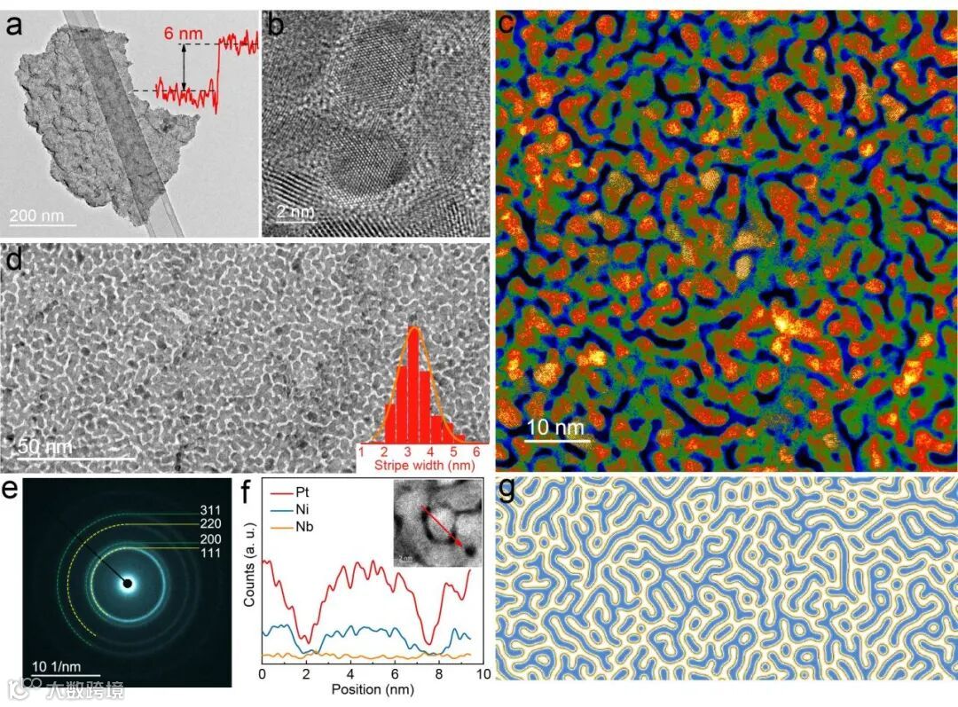 图1. 图灵PtNiNb的结构和形貌表征。a自支撑图灵 PtNiNb 的低倍 TEM 图像。插图是图灵 b c 高分辨率 TEM 和 HAADF-STEM 图像d 均匀分布的图灵条纹的 TEM 图像。e 来自 (c) 的 SAED 图案,以面心立方结构索引。f 图灵条纹的 STEM-EDS 线性扫描分析。g 典型图灵结构示意图。