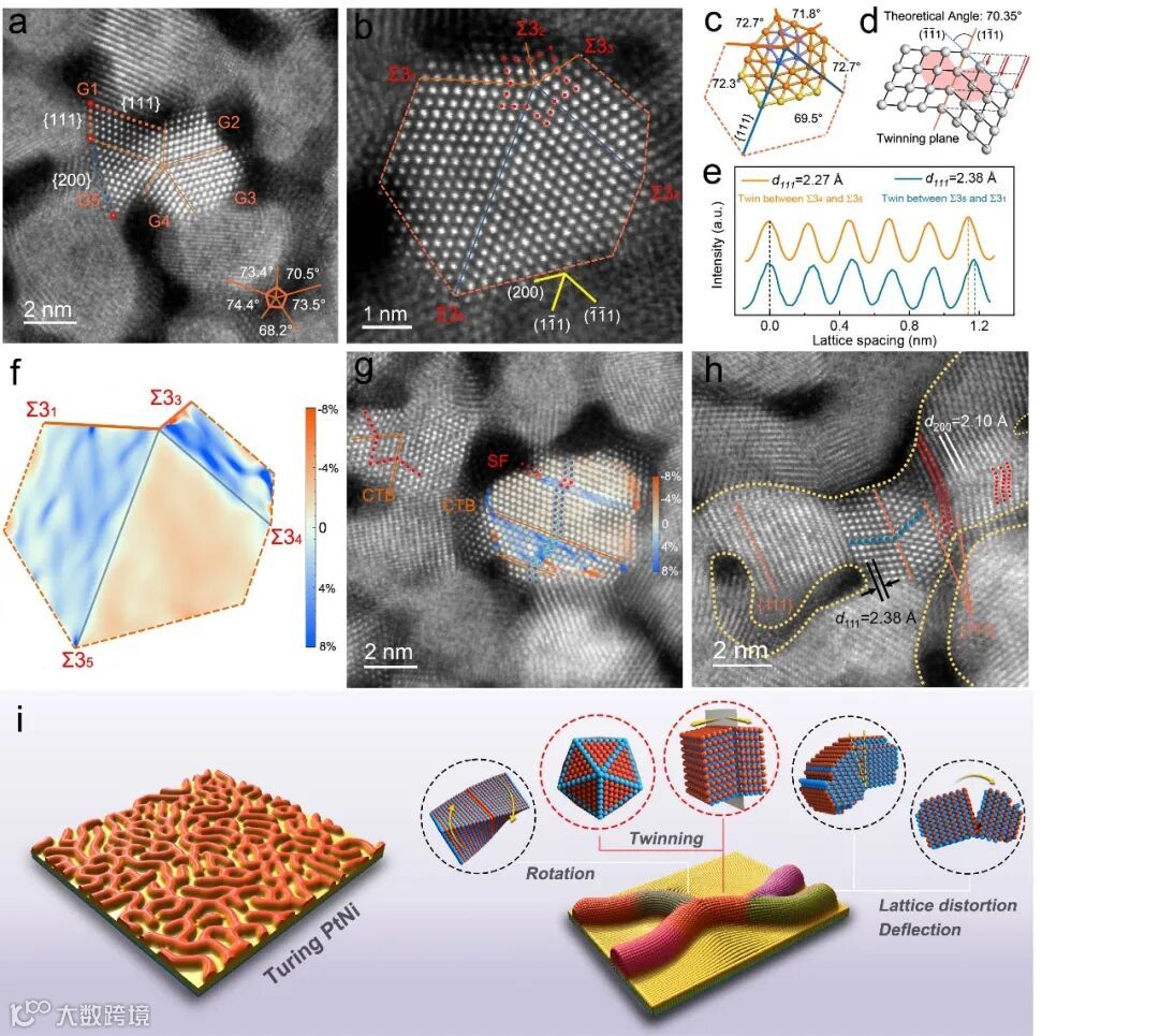图2. 具有高密度缺陷和晶格应变的图灵条纹的微观结构。a原子分辨率 HAADF-STEM 图像。b 图灵条纹分叉处的原子排列。c (b) 中所示的五重孪晶中孪晶边界之间的角度。d fcc结构中(1)和(11)之间的理论角度示意图。e (b) 所示的五重孪晶中子单元沿 {111} 面的强度分布。f (b) 中所示的五重孪晶的虚线标记区域的应变分布图。g 包含孪晶和层错的图灵条纹的组成晶粒以及相应的应变图。h 图灵条纹由沿相似轴向取向的端对端连接的晶粒形成,通过纳米晶体的旋转、扭转、孪生和晶格畸变来调节。i 制备的图灵PtNiNb示意图及相应的晶体学表征。