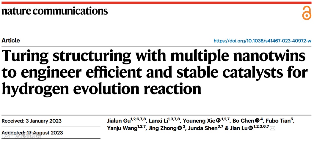 相关研究成果以题为“Turing structuring with multiple nanotwins to engineer efficient and stable catalysts for hydrogen evolution reaction”发表在顶尖期刊《Nature Communications》上。通讯作者为吕坚院士(香港城市大学)。谷佳伦博士和李兰西博士生为论文共同第一作者。其他作者包括:陈博教授,田夫波教授,谢友能博士生,王艳菊博士,钟景博士生,沈君达博士生。