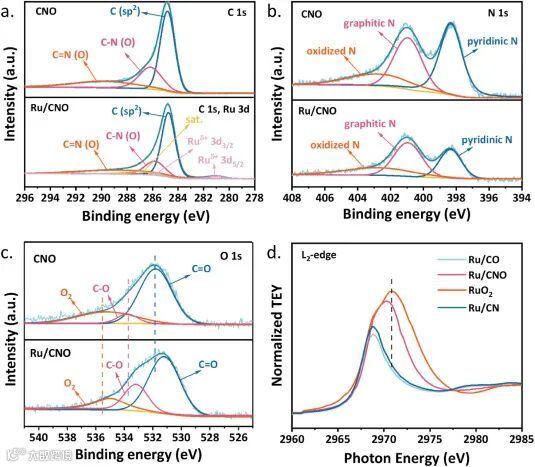 图2. (a) CNO 和 Ru/CNO 的 C1s 和 Ru 3d XPS 谱图; (b) CNO 和 Ru/CNO 的 N1s XPS 谱图; (c) CNO 和 Ru/CNO 的 O1s XPS 谱图; (d)归一化 Ru L2边 XANES 谱图。