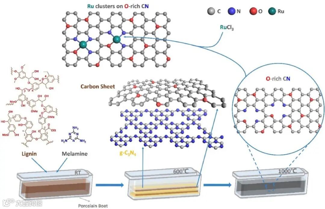 木质素是来自木质纤维素的丰富的可再生天然资源,被认为是制备功能性碳材料的高质量碳源,因为它由 C9酚类单体组成(如图1所示) 有利于碳化。同时,木质素含有包括酚羟基在内的大量的 C-O 键,其中 CAR-O 键能高达466kJ mol-1非常稳定。因此,通过热解木质素可以容易地合成具有丰富表面功能基团的生物炭材料,如 CO,C-O 和 OH。然而,这种木质素单独热解得到的生物炭材料,往往具有有限的孔隙率和表面积,这削弱了在浸渍过程中 Ru 离子在表面上的吸附,导致 Ru的分散性差。所以作者提出,木质素在热解前需要经过三聚氰胺改性,这样可以在碳骨架中诱导 N 种物质,从而提高木质素的石墨化程度,显著增加木质素的表面积和孔隙率,克服上述障碍。