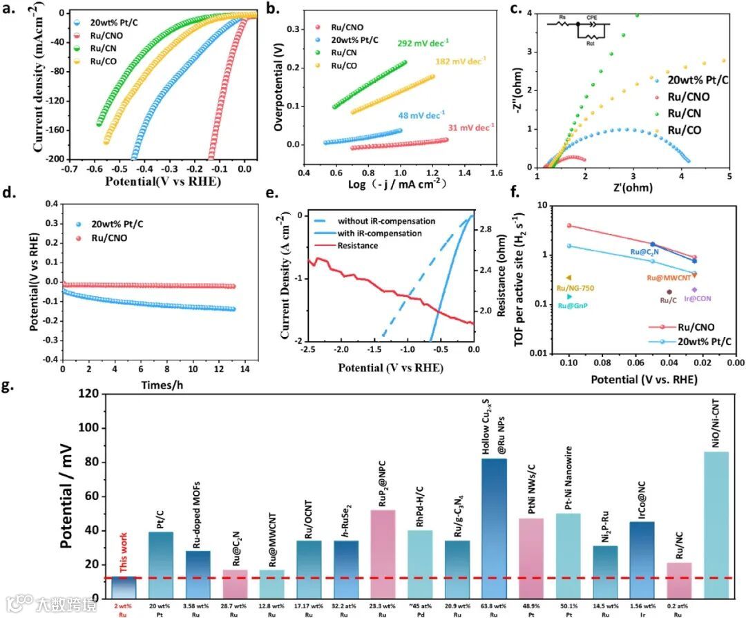 图3. 不同催化剂在1 M KOH 中的表面活性。(a) Ru/CX 和商业20wt% Pt/C 的线性扫描伏安曲线; (b) Ru/CX 和20wt% Pt/C 的 Tafel 图。(c)10mV 的 Ru/CX 和20wt% Pt/C 的 Nyquist 图。(d) Ru/CNO 和20wt% Pt/C 在10mA cm-2下的 V-T 计时电安培响应; (e) Ru/CNO 在高电流密度下有和没有实时 iR- 补偿的 LSV 曲线; (f) Ru/CNO 和20wt% Pt/C 与其他报道的 HER 电催化剂在1M KOH 下的 TOF 值; (g)在碱性条件下与最近报道的 HER 催化剂在10mA cm-2下的过电位的比较。