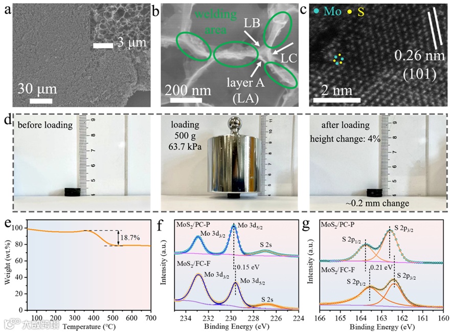 MoS2/FC-F呈现连续多孔网络状,其中碳纳米片通过大面积的重叠区域(绿色圆圈)焊接在一起,形成大量的Y型接触,AC-STEM-ADF图像证实2H-MoS2的存在。压缩性能试验证实了MoS2/FC-F具有较强的结构强度和优异的抗压性能,这有利于电极在电化学反应过程中保持结构完整。此外,TGA结果表明MoS2/FC-F中MoS2的含量为87.2%。XPS结果表明MoS2和FC-F之间有很强的相互作用。