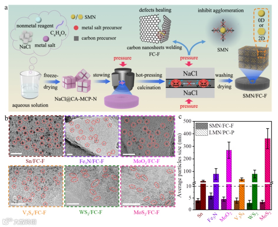近日,天津大学材料科学学院何春年教授、陈彪副教授团队在国际知名期刊Advanced Materials上发表题为“A Universal Cross-Synthetic Strategy for Sub-10 nm Metal-based Composites with Excellent Ion Storage Kinetics”的观点文章。该观点文章报道了一种通用合成策略,通过NaCl盐模板法与粉末冶金技术交叉,在自支撑泡沫碳复合电极(SMN/FC-F)中合成了一系列单分散的SMN(如金属,氮化物,氧化物和硫化物)。外加压力增强的自组装NaCl界面限域作用有效抑制了SMNs团聚,促进了SMNs嵌入由碳纳米片“焊接”形成的自支撑泡沫碳(FC-F)中。这种独特的结构赋予了SMNs/FC-F快速和稳定的离子存储反应动力学。作为验证,MoS2/FC-F表现出优异的碱金属离子存储反应动力学和优异的长循环性能。