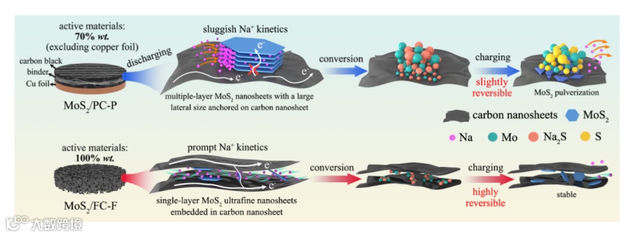 图6. MoS2/FC-F和MoS2/PC-P电极在循环过程中的转化反应机理示意图。