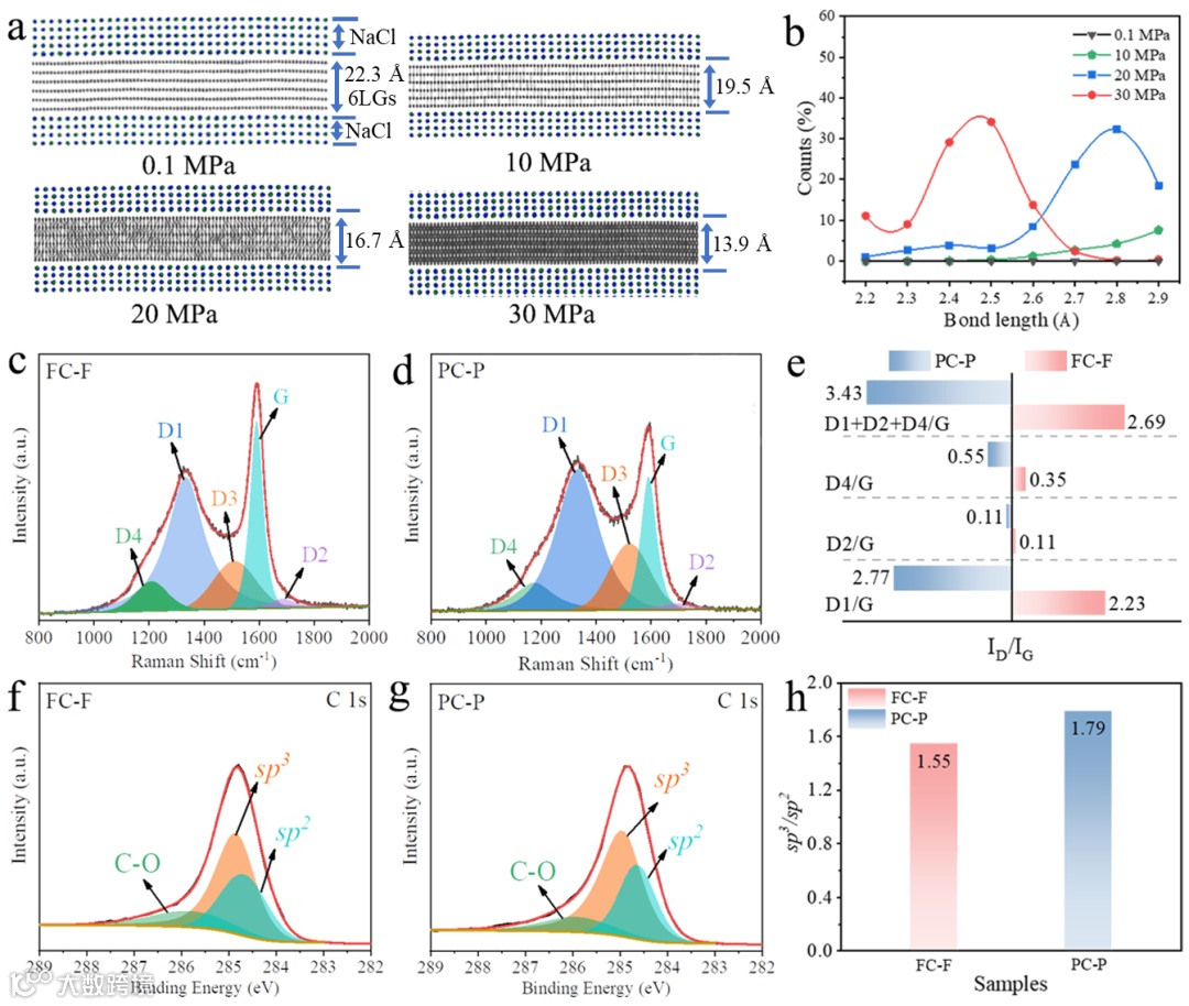 为了进一步确认碳纳米片之间的高压焊接过程,对FC-Fs和PC-Ps的结构缺陷和化学状态进行了分析。拉曼光谱和XPS能谱结果进一步验证了NaCl立方体界面处的高压能显著降低碳材料的结构缺陷,促进碳材料结构愈合,进而形成自支撑泡沫碳。