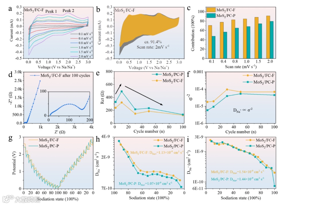 图5. MoS2/FC-F的钠离子电池电化学反应动力学。
