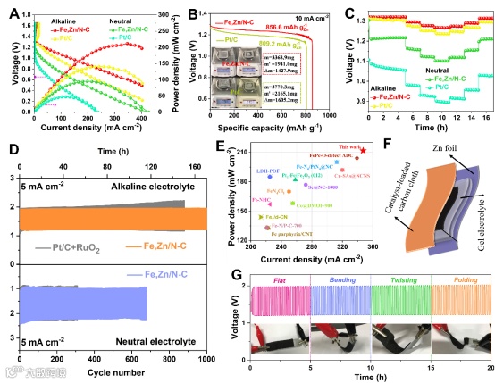 Figure 5. The performance of alkaline, neutral, and flexible Zinc-air batteries driven by Fe,Zn/N-C and the commercial Pt/C. (A) Polarization and power density of alkaline and neutral ZABs driven by Fe,Zn/N-C and Pt/C catalysts. (B) Specific capacities of Fe,Zn/N-C, and Pt/C, normalized by the consumed Zn mass (inset).(C) Galvanostatic discharge of both alkaline and neutral ZABs with Fe,Zn/N-C and Pt/C as electrocatalysts at different current densities. (D) Galvanostatic discharge-charge cycling of two alkaline ZABs (top), and two neutral ZABs (bottom). (E) Comparison of peak power density and current density of Fe,Zn/N-C and other previous report as listed in Table S11. (F) Schematic illustration of a homemade flexible quasi-solid-state ZAB. (G) Cycling plots of flexible ZAB upon different deformations.