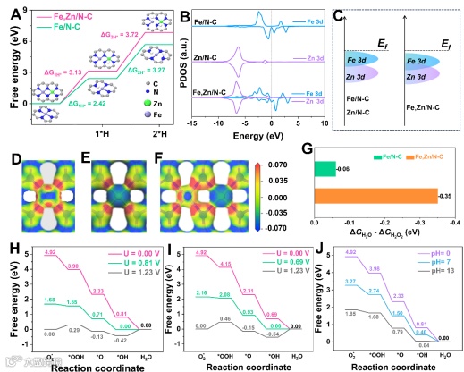 (G) The theoretical free energy difference between the rate-determining step for 4e and 2e ORR processes (ΔGH2O - ΔGH2O2). (H and I) The free energy diagrams for Fe,Zn/N-C and Fe/N-C. (J) pH-corrected free energy diagram of Fe,Zn/N-C.