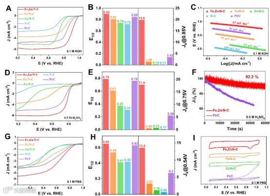 (E) Bar graphs comparing half-wave potentials and kinetic current densities of all samples in 0.5 M H2SO4 (HClO4 solution for Pt/C) (the colors of parameters for the samples correspond to those of LSV curves). (F) The chronoamperometric stability tests of Fe,Zn/N-C and Pt/C under acidic condition.(G) LSV polarization curves of Fe,Zn/N-C and other comparison samples in 0.1 M PBS.(H) Bar graphs comparing half-wave potentials and kinetic current densities of all samples in 0.1 M PBS (the colors of parameters for the samples correspond to those of LSV curves). (I) CVs of all samples for ORR catalysis in 0.1 M PBS solution before (solid line) and after (dashed line) adding methanol.
