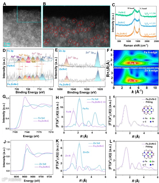 Figure 2. Structural characterizations of as-prepared catalysts. (A and B) AC-HAADF-STEM and enlarged image of Fe,Zn/N-C.(C) Raman of all samples. (D) High-resolution Fe 2p XPS spectra of Fe/N-C and Fe,Zn/N-C. (E) High-resolution XPS Zn 2p spectra of Zn/N-C and Fe,Zn/N-C. (F) Wavelet transform (WT) contour plots of Fe,Zn/N-C. (G) XANES of Fe K-edge for Fe,Zn/N-C and Fe foil. (H) FT EXAFS in R space for Fe,Zn/N-C and Fe foil. (I) Corresponding EXAFS fitting curves at the Fe K-edge of Fe,Zn/N-C.(J) XANES of Zn K-edge for Fe,Zn/N-C and Zn foil.(K) FT EXAFS in R space for Fe,Zn/N-C and Zn foil. (L) Corresponding EXAFS fitting curves at the Zn K-edge of Fe,Zn/N-C.