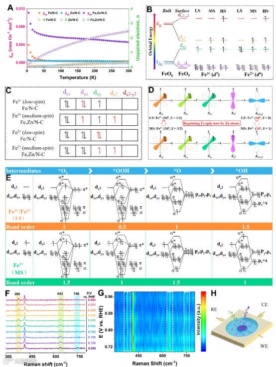 Figure 3. Insight into 3d-orbital electronic configurations and in situ spectroelectrochemistry of as-synthesized samples. (A) M-T plots and the unpaired 3d-electron number of all containing-metal samples. (B) Schematic diagram of the 3d-orbital splitting manner for five-coordinated Fe atoms. (C) 3d-electron configurations of iron cations in different spin state on the surface of catalysts. (D) The transformation and orientation of the five d orbitals of Fe. (E) The orbital interactions between iron cations over Fe,Zn/N-C and oxygen-containing intermediates. (F and G) The Raman spectra and contour maps of Fe,Zn/N-C polarized at different potentials in O2 saturated alkaline solutions.(H) Schematic of the in-situ Raman electrochemical device.