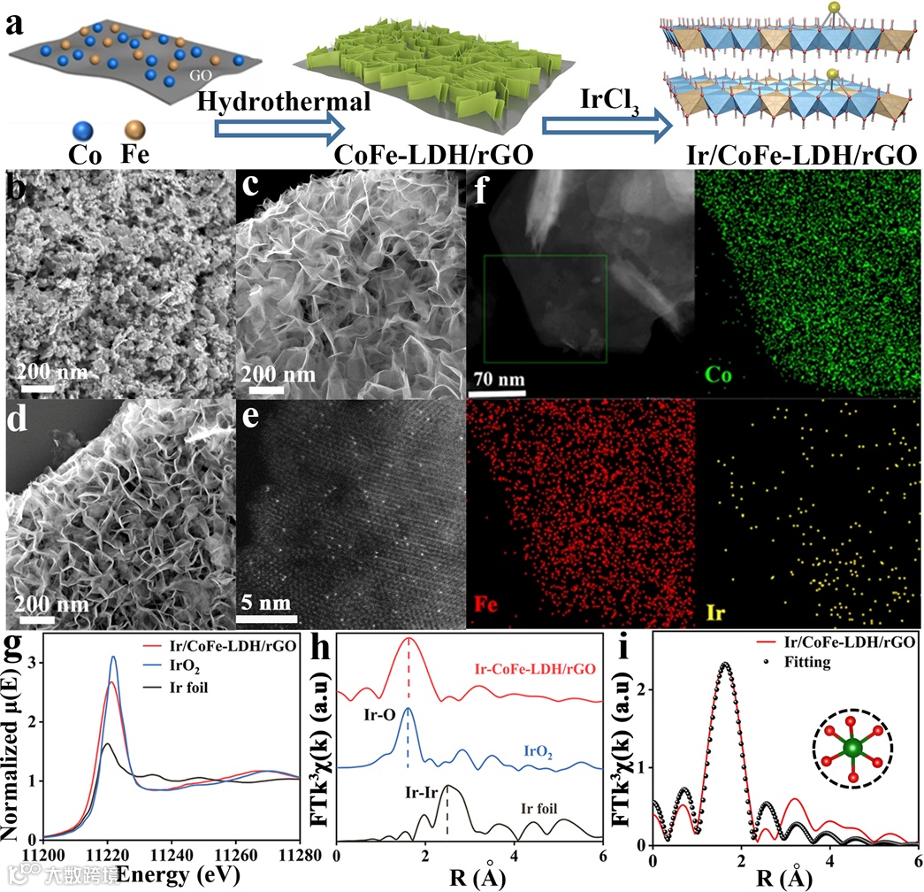 图1 电催化剂的合成策略以及结构表征。(a) 形成 Ir/CoFe-LDH/rGO 的水热浸渍过程示意图。(b-d)CoFe-LDH(b)CoFe-LDH/rGO(c)和 Ir/CoFe-LDH/rGO(d)的 FESEM 图像。(e)Ir/CoFe-LDH/rGO 的球差校正STEM 图像。(f)Ir/CoFe-LDH/rGO 的 HAADF-STEM 图像以及相应的Co、Fe、Ir 的 EDS 元素能谱。(g) Ir/CoFeLDH/rGO、IrO2 和 Ir 箔的 Ir L3 边归一化 XANES 和 (h) EXAFS 光谱。(i) Ir-CoFeLDH/rGO 的 Ir L3 边的实验和拟合 EXAFS 光谱,插图显示了根据拟合数据得出的 Ir/CoFeLDH/rGO 的 Ir 中心的第一壳配位,红色和绿色球体分别代表 O 原子和 Ir 原子。