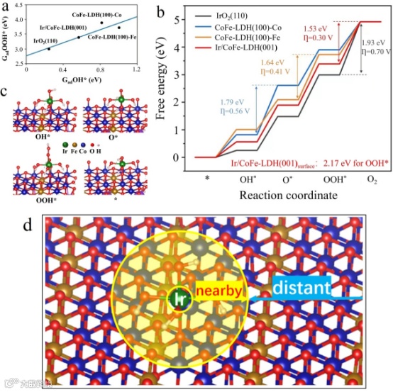 图 4 (a) OOH* 的吸附能与 OH* 的吸附能之间的线性比例关系。(b) 0 V 时 OER 与 RHE 在 IrO (110)、CoFe-LDH(100)-Co、CoFe-LDH (100)-Fe 和 Ir/CoFe-LDH (001) 表面上的反应自由能图。(c) Ir/CoFe-LDH(001)表面上 OER 反应中间体的结构。(d) 从活性中心和载体的角度对 Ir/CoFe-LDH (001) 表面催化机制的示意图。