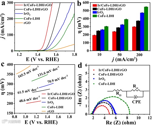 图2:电化学活性表征。图 2 (a) OER 极化曲线,(b) 10、50 和 200 mA cm-2 时的过电位,(c) Ir/CoFe-LDH/rGO、CoFe-LDH/rGO、IrO2 和 CoFe-LDH的tafel斜率;(d) Ir/CoFe-LDH/rGO、CoFe-LDH/rGO、IrO2 和 CoFe-LDH 的EIS图。