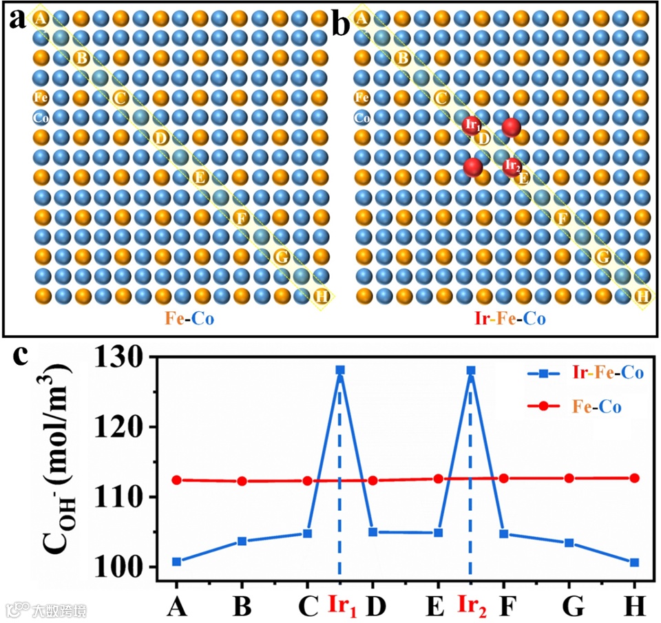 图5:有限元模拟。(a-b)Fe-Co(a)和Ir-Fe-Co(b)构型模型的俯视图。由 225 个球形粒子组成的阵列为 Fe-Co 构型,阵列顶部的四个球形粒子为Ir原子。字母A、B、C、D、E、F、G 和 H 表示对角线上的八个 Fe位点,Ir1和 Ir2是对角线中心的两个Ir原子。(c)在Fe-Co和 Ir-Fe-Co构型中,八个 Fe 位点(A-H)和两个 Ir 位点上的OH-浓度。