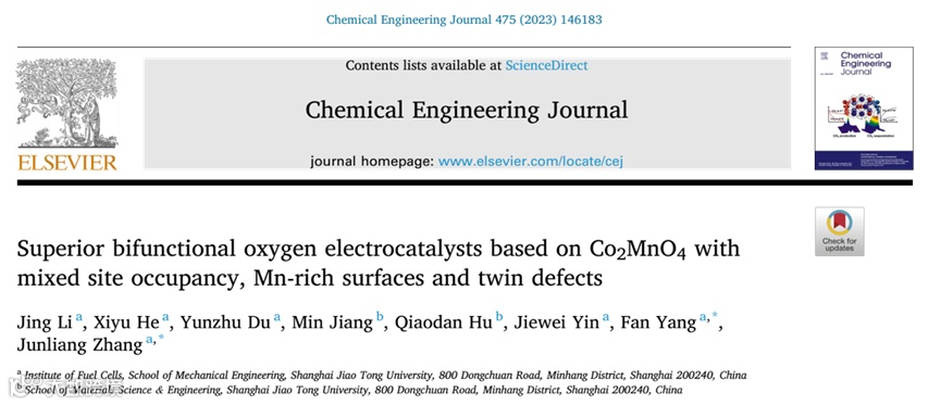 基于此,来自上海交通大学机械与动力工程学院燃料电池研究所的杨帆副教授和章俊良教授,在国际知名期刊Chemical Engineering Journal上发表了题为“Superior bifunctional oxygen electrocatalysts based on Co2MnO4 with mixed site occupancy, Mn-rich surfaces and twin defects”的研究论文。论文第一作者为博士生李静。