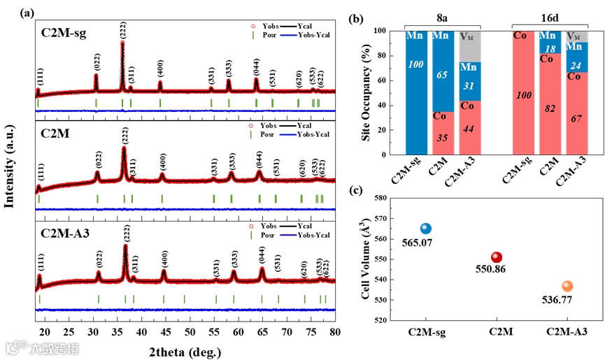 图1 C2M-sg,C2M和C2M-A3的晶体结构:(a) XRD谱图以及Rietveld精修结果,(b) Co、Mn和阳离子空位在晶体不同位置的占比,(c) 晶胞体积大小。