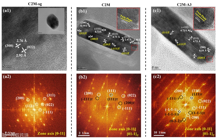 图2 C2M-sg,C2M和C2M-A3 的HRTEM图像和FFT衍射花样。