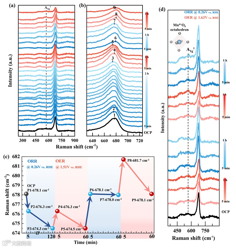图6 C2M催化过程的原位拉曼测试:(a) OER和ORR交替反应的原位拉曼光谱 (OER电压: 1.51V vs RHE, ORR电压: 0.26V vs RHE);(b) 原位拉曼光谱(a)的局域放大图;(c) A1g特征峰的偏;(d)原位拉曼光谱 (OER电压: 1.63V vs RHE, ORR电压: 0.26V vs RHE)。