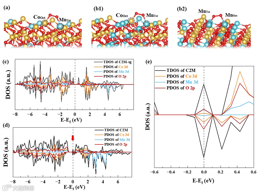 图7 C2M-sg和C2M的DFT计算:(a) C2M-sg表面的O2桥式吸附;(b1)和(b2) C2M表面的O2桥式吸附;(c), (d) C2M、C2M-sg的态密度图;(e) C2M在Fermi面附近局部放大的态密度图。