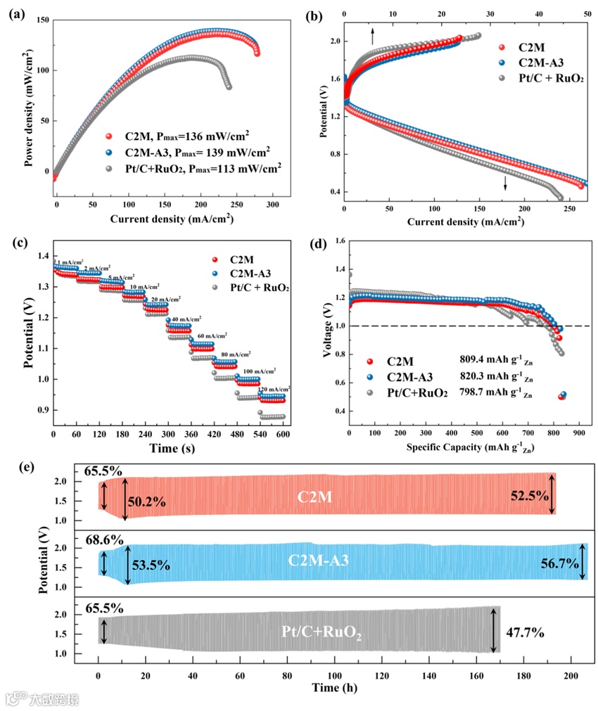 图5 使用C2M、C2M-A3和Pt/C + RuO2作为阴极催化剂的RZAB性能:(a)功率密度图,(b)充-放电极化曲线,(c)不同电流密度的放电曲线,(d)比容量,(e)充放电循环测试曲线。