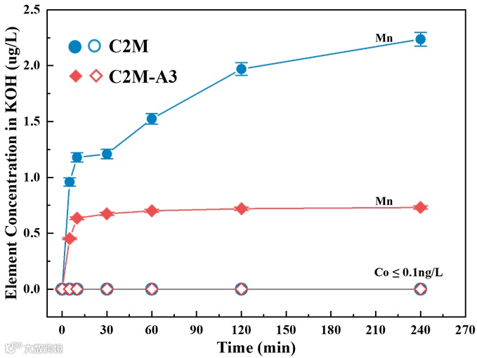 图8 0.45 V vs RHE 恒电位ORR测试中,C2M和C2M-A3对应的KOH电解液中Co、Mn离子的浓度变化。