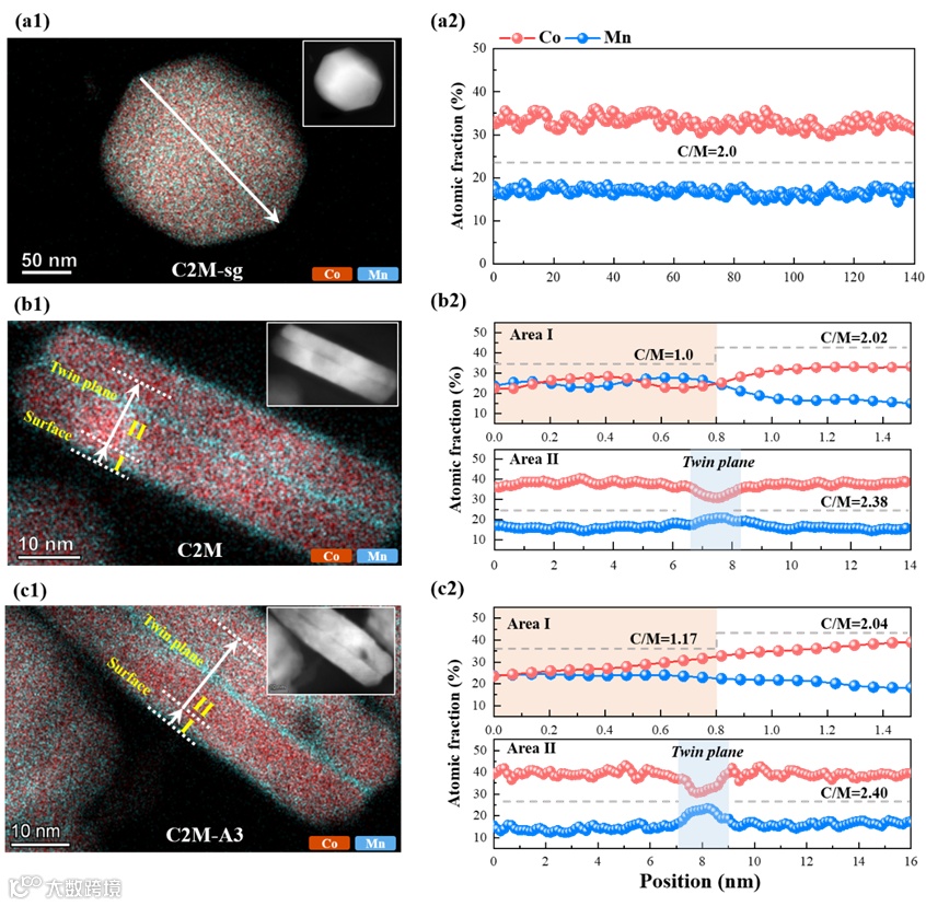 图3 HADDF-STEM图像、EDS面扫描图和Co/Mn的原子比:(a1-2) C2M-sg,(b1-2) C2M,(c1-2) C2M-A3。