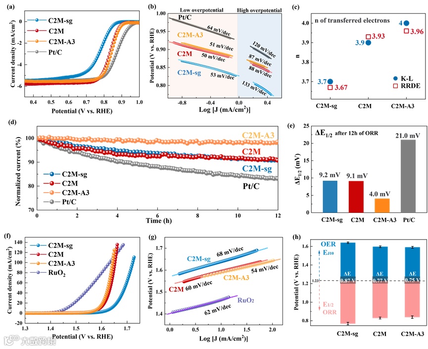 图4 C2M-sg、C2M和C2M-A3的电化学性能:(a) ORR极化曲线; (b) ORR的 Tafel曲线; (c) 根据K-L图和RRDE测试计算的ORR的电子转移数; (d) 在0.45 V vs RHE恒压下的ORR稳定性测试;(e) ORR耐久性测试后E1/2的变化; (f) OER极化曲线; (g) OER的Tafel曲线; (h) 双功能电催化性能。