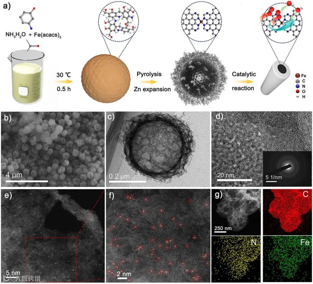 当前大多催化剂的制备中碳化过程是不可控的,几何结构的坍塌和多孔通道的收缩,导致大量的活性位点埋藏在碳载体中。碳纳米笼由于足够中空的内腔、互穿的多孔通道、较大的比表面积、易于杂原子掺杂和调制可控等优点,正成为构建负载型单原子催化剂的新平台。然而,现有的大多数合成策略只关注内部空心结构的设计,而对外部活性表面的设计很少。为解决上述问题提出了具有高活性表面的高开放碳纳米笼,用以负载Fe单原子活性位点可达到高暴露和高可及的效果。当前大多催化剂的制备中碳化过程是不可控的,几何结构的坍塌和多孔通道的收缩,导致大量的活性位点埋藏在碳载体中。碳纳米笼由于足够中空的内腔、互穿的多孔通道、较大的比表面积、易于杂原子掺杂和调制可控等优点,正成为构建负载型单原子催化剂的新平台。然而,现有的大多数合成策略只关注内部空心结构的设计,而对外部活性表面的设计很少。为解决上述问题提出了具有高活性表面的高开放碳纳米笼,用以负载Fe单原子活性位点可达到高暴露和高可及的效果。