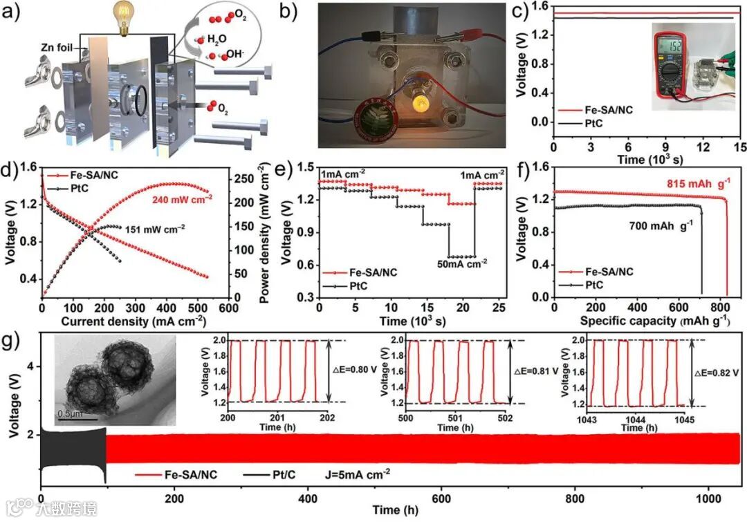 图4. Fe-SA/ NC组合可充电锌空气电池的电化学性能